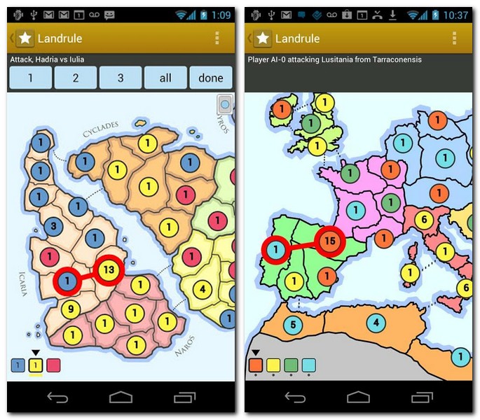 Wer vom Brettspielhit „Risiko“ nicht genug bekommen kann, für den ist „Landrule Strategy of War“ der perfekte Begleiter für unterwegs. In dem rundenbasierten Spiel nimmst du mit deinen Armeen wie im bekannten Vorbild Zug um Zug eine Landkarte ein. Die Auswahl reicht dabei von schemenhaften Welt- und Kontintentansichten bis zu fiktiven Karten, die du als In-App-Käufe zusätzlich herunterladen kannst.
