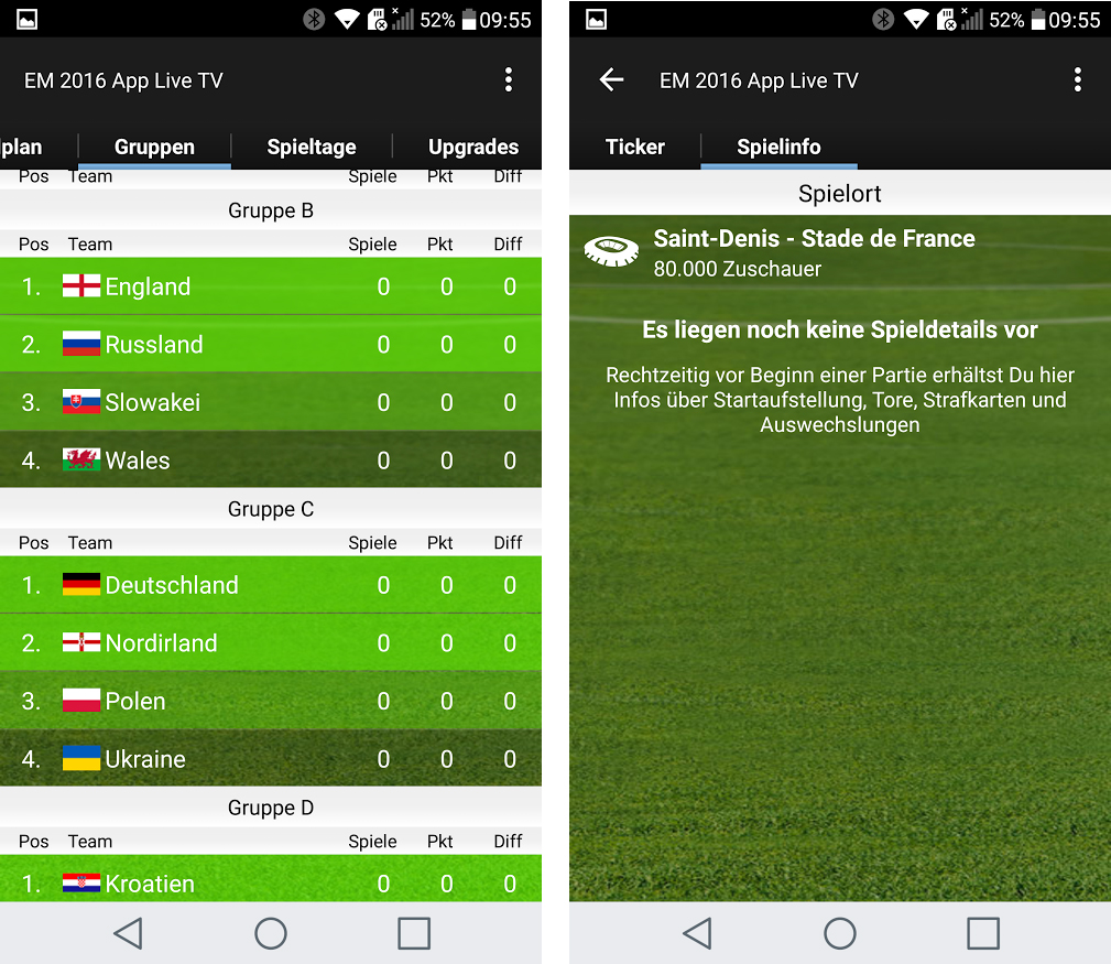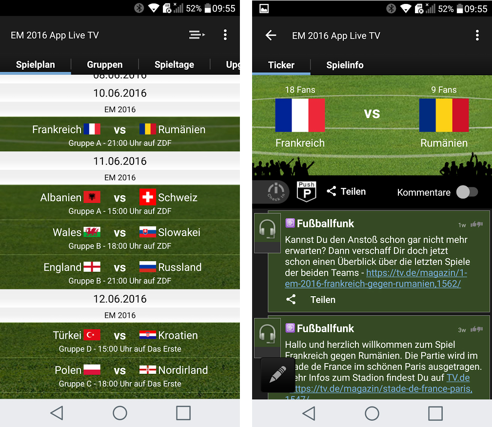Ein absolutes Muss für alle Fußball Enthusiasten ist die „EM 2016 App“ von Tv.de. Wer die App im EM Zeitraum werbefrei genießen möchte, kann die Pro Version für 0,99€ erwerben. Als kleiner Bonus kann die Werbefreiheit auch für alle anderen Apps von Couchfunk / Tv.de genutzt werden.