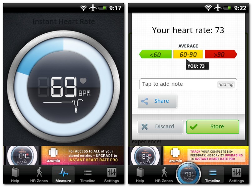 Die kostenpflichtige Version „Instant Heart Rate – Pro“ (0,76 €) verzichtet auf Werbeeinblendungen. Erweist sich ein Smartphone als nicht leistungsfähig genug für die App, dann empfiehlt es sich, zur älteren Version „Instant Heart Rate – Classic“ zu greifen.