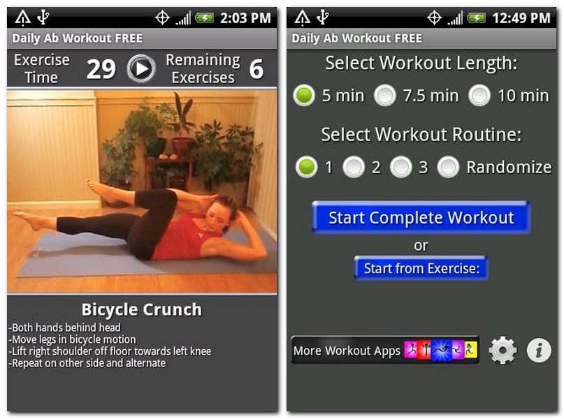Zu Beginn muss der Zeitrahmen, in dem man die Übungen absolvieren möchte, festgelegt werden: Zur Auswahl stehen hier fünf, siebeneinhalb oder zehn Minuten, je nach Grundfitness. Außerdem gibt es drei verschiedene Übungen. Gestartet werden kann danach entweder das komplette Workout oder, wenn man nicht so viel Zeit hat, auch nur einzelne Übungen. Diese werden in einer bebilderten Liste angezeigt, so fällt auch die englische Sprache nicht ins Gewicht.