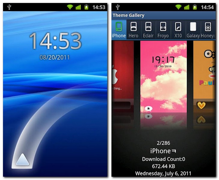 Die Themens, also die Vorlagen, die LockBot für den Entriegelungsbildschirm bietet, sind jeweils einem bereits real bestehenden Vorbild nachempfunden. So findet sich die von Android Froyo Geräten bekannte Mischung aus Sperr- und Stummschaltebildschirm genauso wie der langgezogene IPhone-Slider in Pfeilform. Darüberhinaus stellt LockBot noch die Themes Hero, Eclair, X10, Galaxy und Honeycomb zur Verfügung, wobei für jedes Theme in der Regel mehrere hundert downloadbarer Designs zur Verfügung gestellt, damit auch der Hintergrund des Sperrbildschirms ordenltich aufgepeppt werden kann.