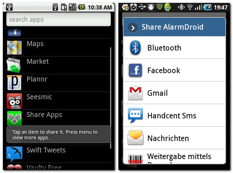 Über den Android App Market können Sie Ihre beliebtesten Apps an Verwandte und Familienmitglieder weiterempfehlen. Nehmen Sie doch einfach mal ‘Share Apps’ zur Hand. (kostenlos)