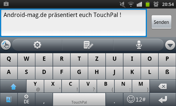 Da die Inbetriebnahme von Touchpal auf Deutsch einige Problemherde birgt, hier eine kurze Anleitung: Zu aller erst ist darauf zu achten, nicht nur die eigentliche App, sondern auch die deutsche Sprachdatei mit zu installieren. Nach der Installation öffnet man die App und befolgt die vier Installations-Steps, was dazu führt, dass Touchpal für alle Bereiche als Tastatur festgelegt wird.  Als nächstes ruft man die Nachrichten-App auf und wählt über einen langen Touch auf das Eingabefeld – „Eingabemethode“ auf, bei der man nun  „Touch-Pal Keyboard“ wählt. Als finalen Schritt sollte man nun über das „Einstellung-Symbol noch „QWERTZ“ als „Keyboard-Layout“ auswählen.