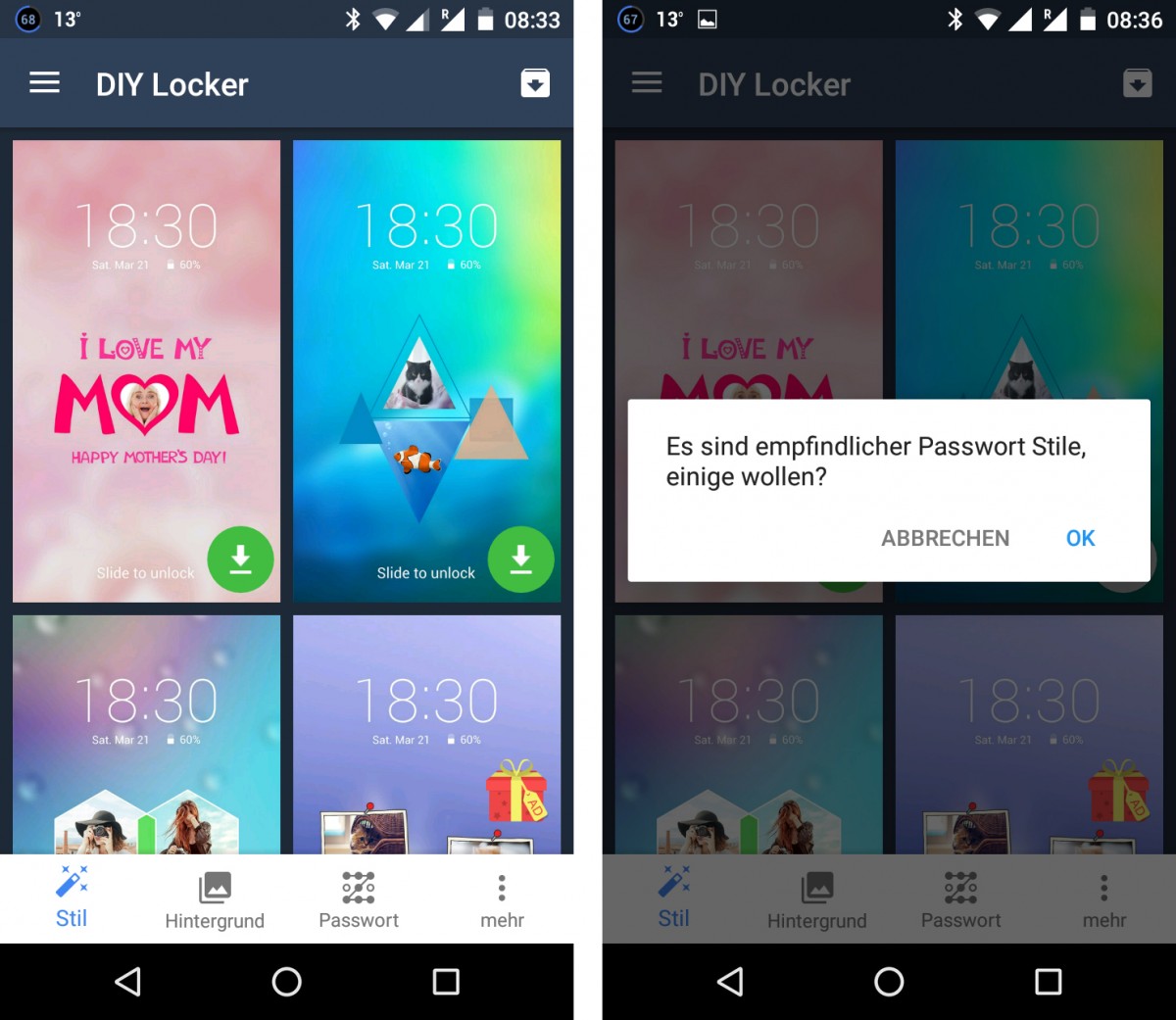Anwender, die möchten, dass sie auf dem Sperrbildschirm statt einer grauen Fläche etwa die heimische Miezekatze angrinst, wählen lediglich eines der vorgefertigten Templates aus und füllen diese mit eigenen Fotos. Gleiches gilt für die Muster des Sperrbildschirms. Die Einstellungen lassen sich innerhalb von Minuten durchführen, danach steht das sehr individuell gestaltete virtuelle Vorhängeschloss.