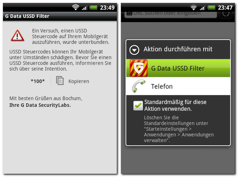 Die Security-App G Data USSD Filter schützt Sie vor Internet- Links, die Telefonnummern enthalten. Das ist deshalb nötig, weil in derartigen Links auch Steuerungs-Codes vorkommen können – mit denen es beispielsweise möglich ist, auf einigen Smartphones den kompletten Speicher zu löschen.