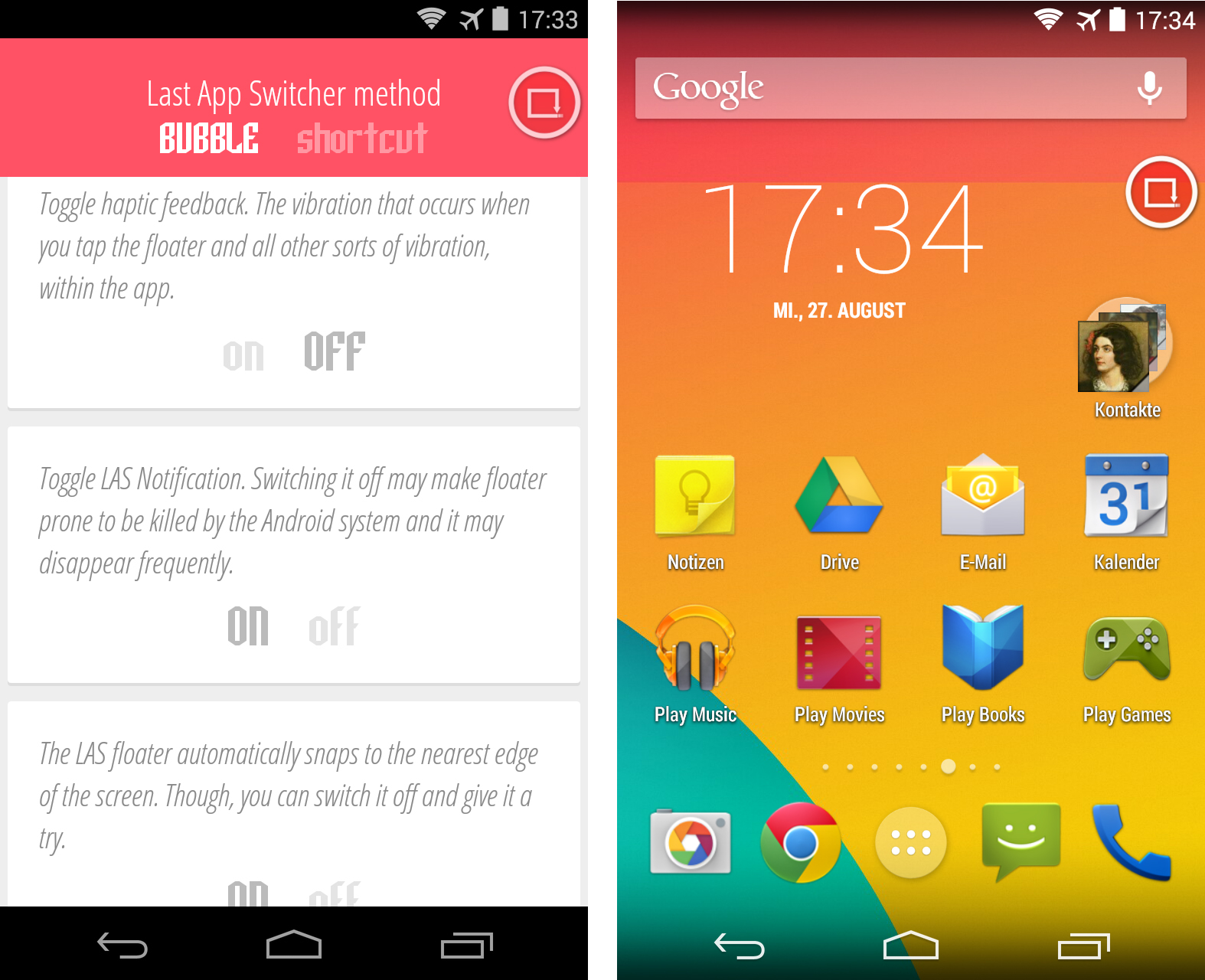 Standardmäßig zeigt LAS eine Schaltfläche an, die jederzeit zu sehen ist – egal, welche App du gerade verwendest. Damit dir diese Schaltfläche beim Bedienen anderer Apps nicht im Wege ist, kannst du sie beliebig verschieben. Zudem darfst du ihre Größe, ihre Farbe und ihre Durchsichtigkeit festlegen.