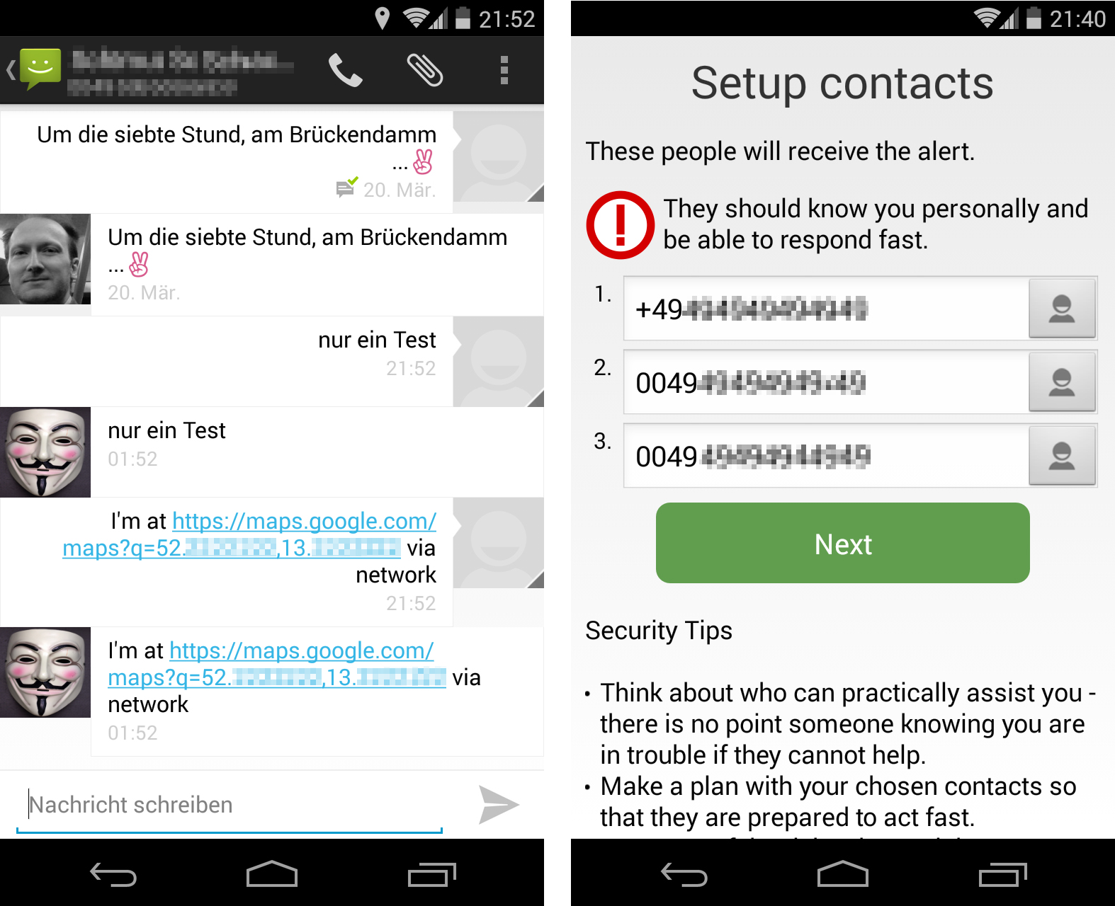 Du aktivierst den Hilferuf, indem du die Einschalttaste des Smartphones mehrmals schnell hintereinander betätigst. Daraufhin verschickt die App in regelmäßigen Abständen per SMS eine vorgegebene Nachricht an bis zu drei Empfänger. Den Text dieser Nachricht darfst du selbst festlegen. Zusätzlich enthält die Nachricht die GPS-Koordinaten deines gegenwärtigen Aufenthaltsortes – auch in Form eines Google-Maps-Links.