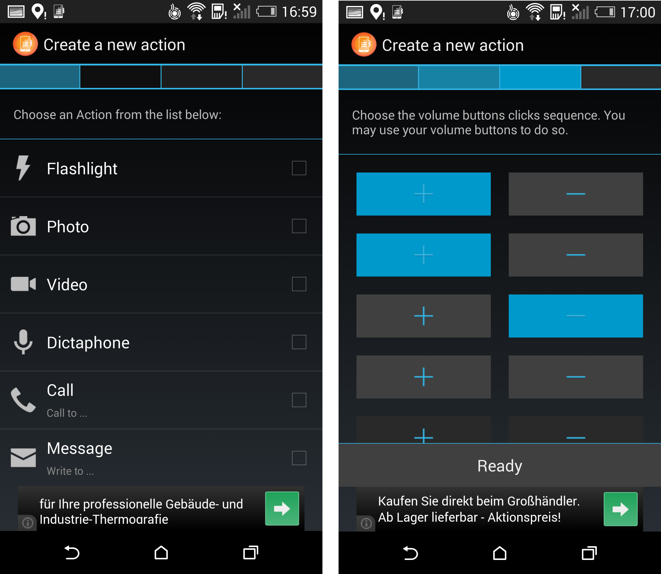 Dazu musst du einfach nur die App starten, die gewünschte Aktion auswählen und eine Abfolge festlegen. Zum Beispiel aktiviert bzw. deaktivert die Abfolge Lauter, Lauter, Leiser das WLAN, während Leiser, Leiser, Lauter die Facebook-App startet.