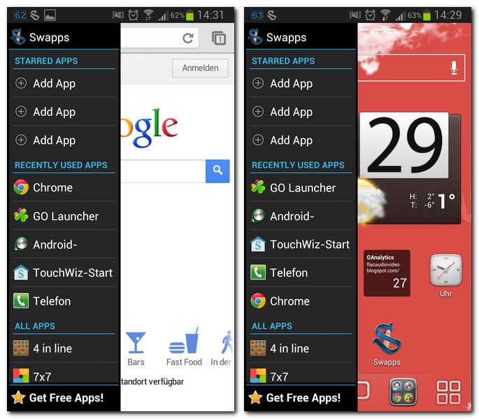 Swapps ist eine Sidebar, die du mit einem Wisch von der Seite einblenden kannst – in dieser lassen sich Anwendungen anpinnen, die du mit diesem Shortcut somit schneller erreichst. Samsung Smartphone-Nutzer werden ein ähnliches Feature von der Multiwindow-Funktion der Touchwiz-Oberfläche unter Android 4.1 kennen. Diese App bringt nun diese nützliche Funktion auch auf andere Smartphones mit Android. Neben den selbst festgelegten Anwendungen findest du in der Leiste außerdem die zuletzt verwendeten Anwendungen. Das ist besonders praktisch, wenn du schnell zwischen mehreren Anwendungen hin und her switchen möchtest, beispielsweise wenn du auf deinem Smartphone in einem Office-Programm einen Text schreibst und zwischendurch auf eine Internetrecherche mit dem Browser zurückgreifen musst. Die Leiste funktioniert mit vielen Anwendungen wie Google Mail, Google Chrome, der Notiz-App, der Nachrichtenanwendung und so weiter, allerdings lässt sich unter manchen Anwendungen die App-Leiste nicht hervorholen.