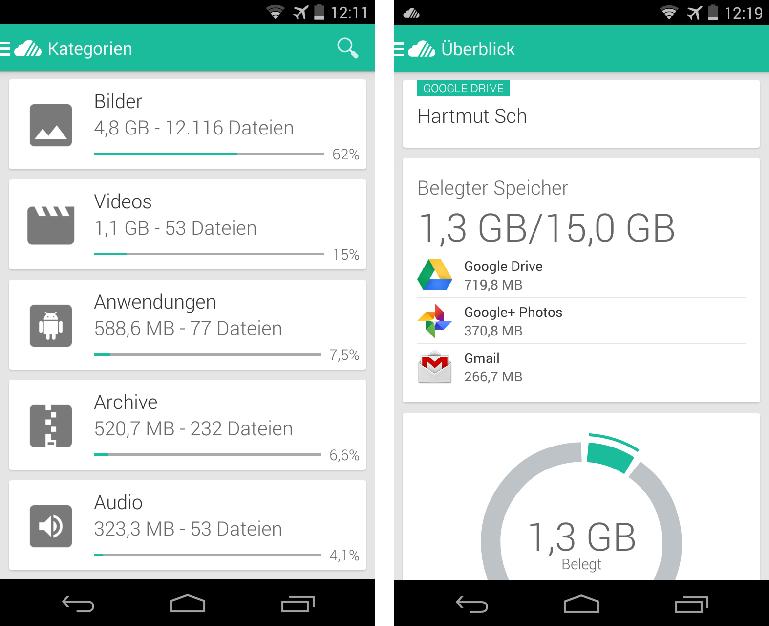 Die App Unclouded macht den Umgang mit Online-Speicherdiensten komfortabler: Einerseits zeigt die Software wie ein herkömmlicher Datei-Manager die Inhalte der Cloud-Speicher an und kann die Dateien auch herunterladen, um sie darzustellen. Andererseits aber ist Unclouded imstande, die gefundenen Dateien in Kategorien wie „Bilder“, „Videos“, „Anwendungen“, „Texte“ und „Tabellen“ unterteilt aufzulisten. Für jede dieser Kategorien verrät die App dir die Gesamtgröße der Dateien und den prozentualen Anteil am zur Verfügung stehenden Speicher.