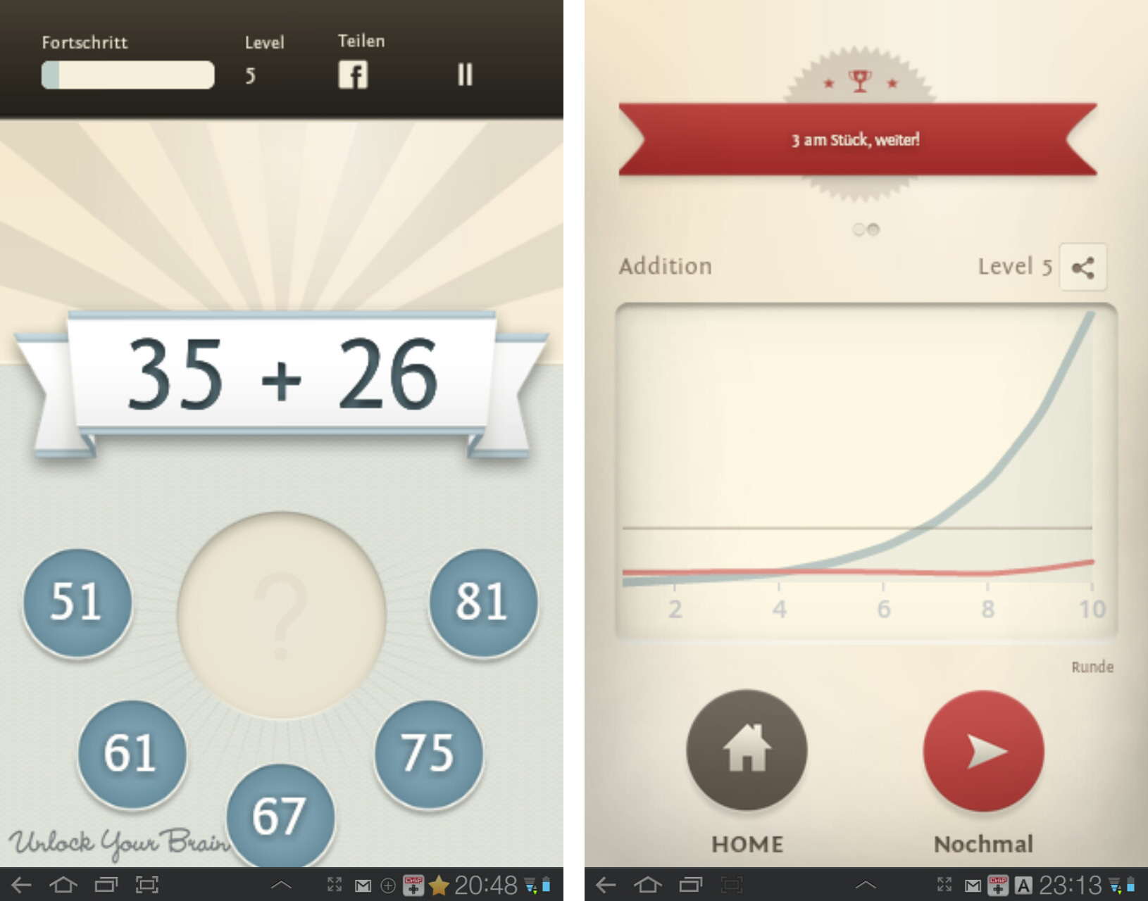 Steigern kannst du deine Fähigkeiten im Trainings-Modus, weil in diesem Modus die Aufgaben tatsächlich rasch schwieriger werden. Da bist du schnell einmal im vierstelligen Bereich, wenn du gut bist, aber am Lockscreen fällst du wieder in die Grundschulzeit zurück. Dabei müsste die App doch nun schon wissen, dass du ein kleines Mathegenie bist.