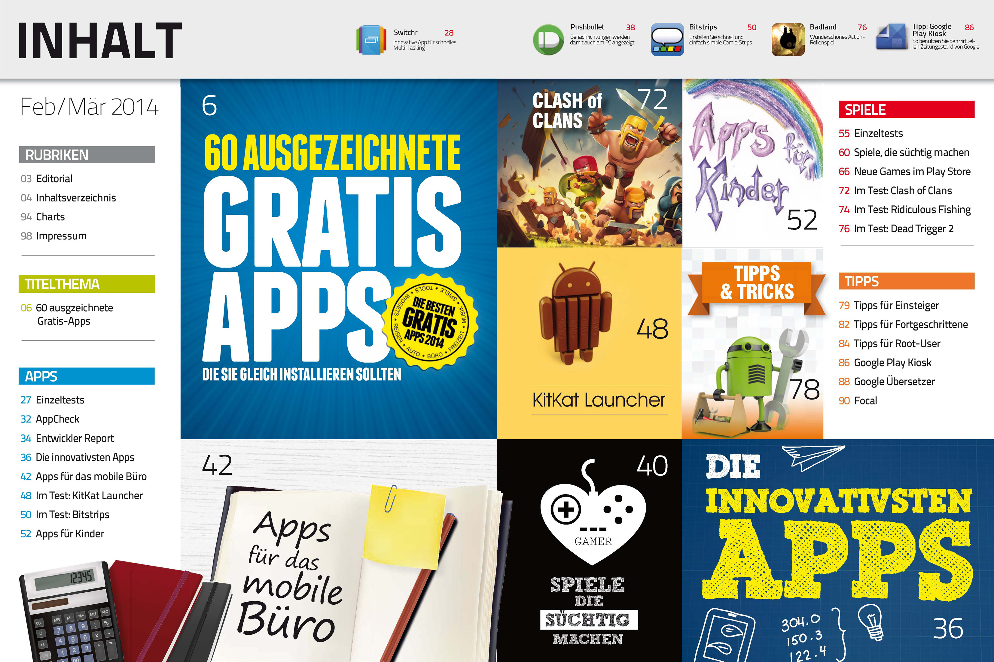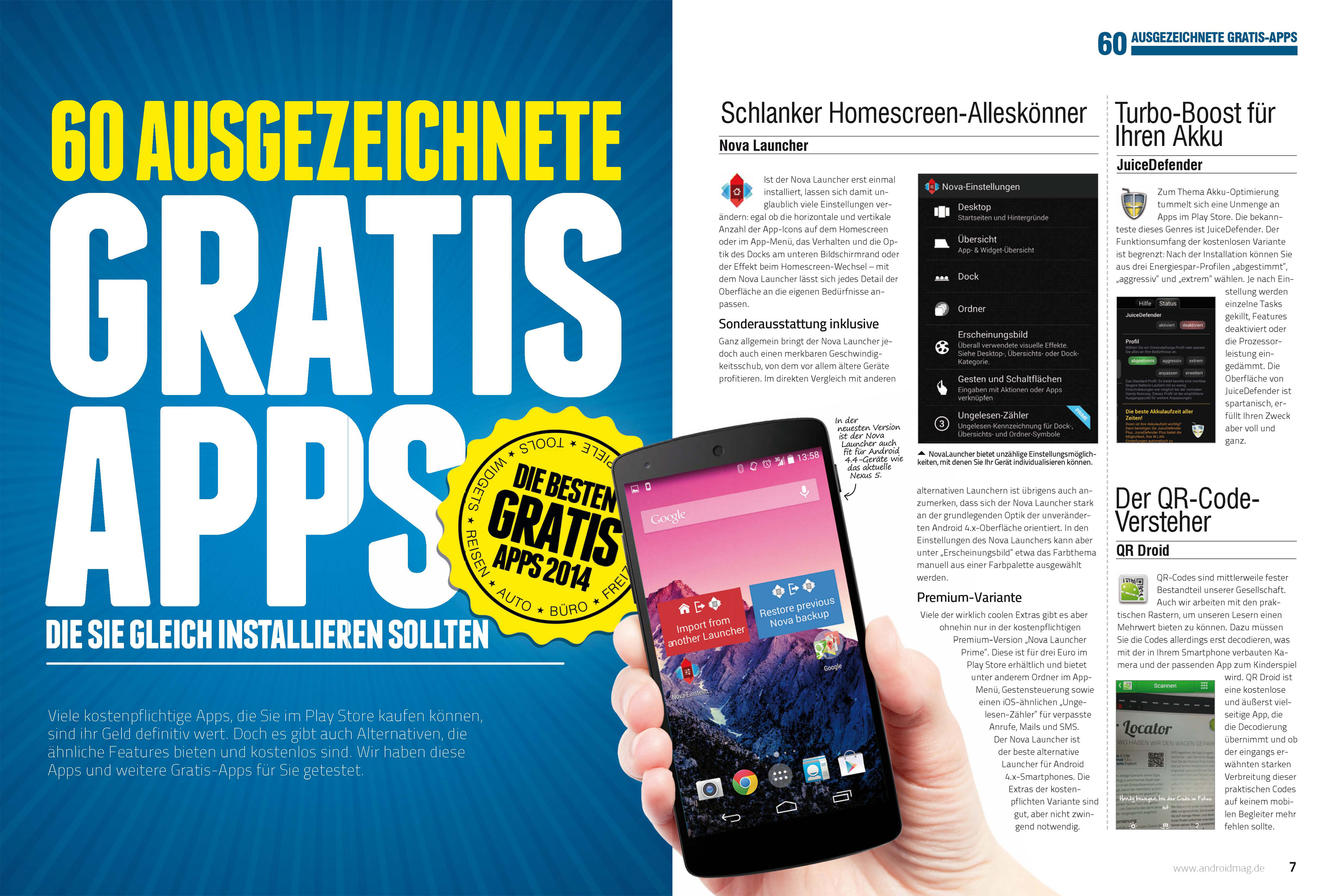 Zum Start ins Jahr 2014 haben wir in Android Apps Ausgabe 11 eine Auswahl der besten Gratis-Apps zusammengetragen. Auf 20 Seiten stellen wir dir Produktivitäts- und Systems-Tools, Foto-Apps, Personalisierungs-Applikationen und vieles mehr vor. Bei 70 Apps dürfte sicherlich für jeden Geschmack das Richtige dabei sein.