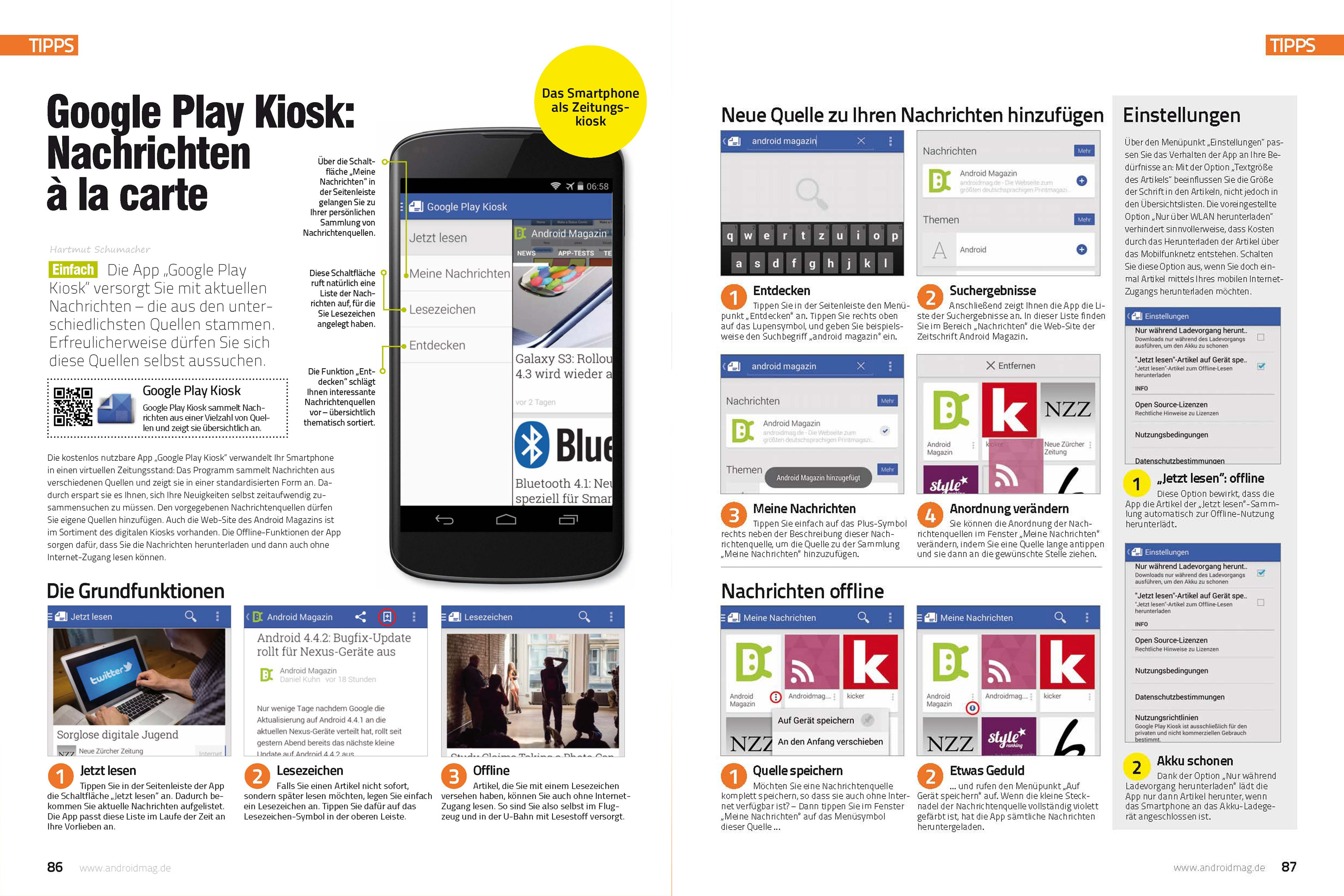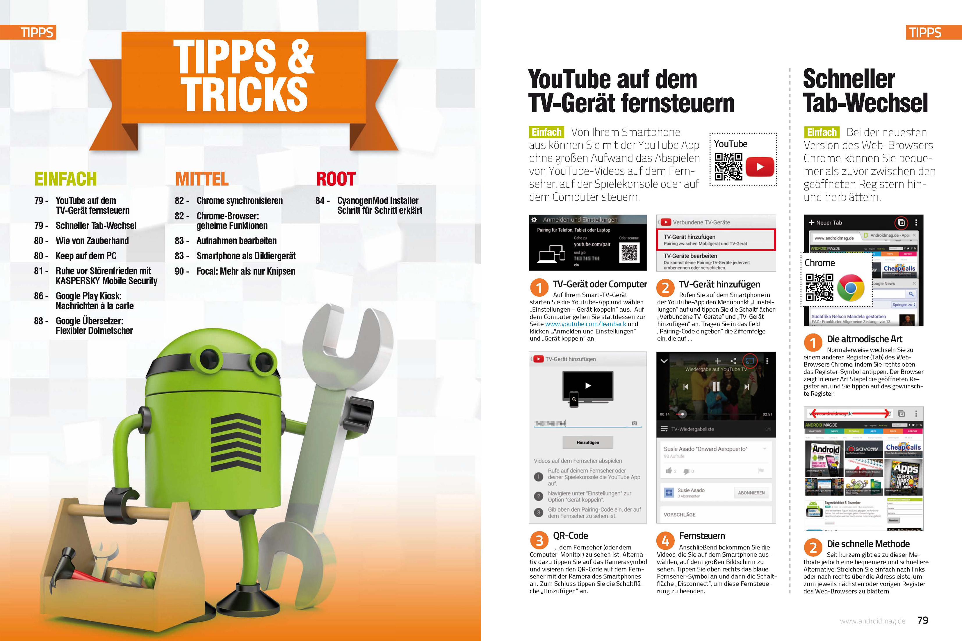 Im letzten Drittel des Heftes gibt es dann wie immer nützliche Tipps und Anleitungen, die für jeden Android-Nutzer einen echten Mehrwert darstellen. Wir beleuchten unter anderem die empfehlenswerte Foto-App Focal, geben Tipps zur Nutzung der Sprachen-App Google Übersetzer und erklären dir die Runderneuerte Nachrichten-App Google Play Kiosk.