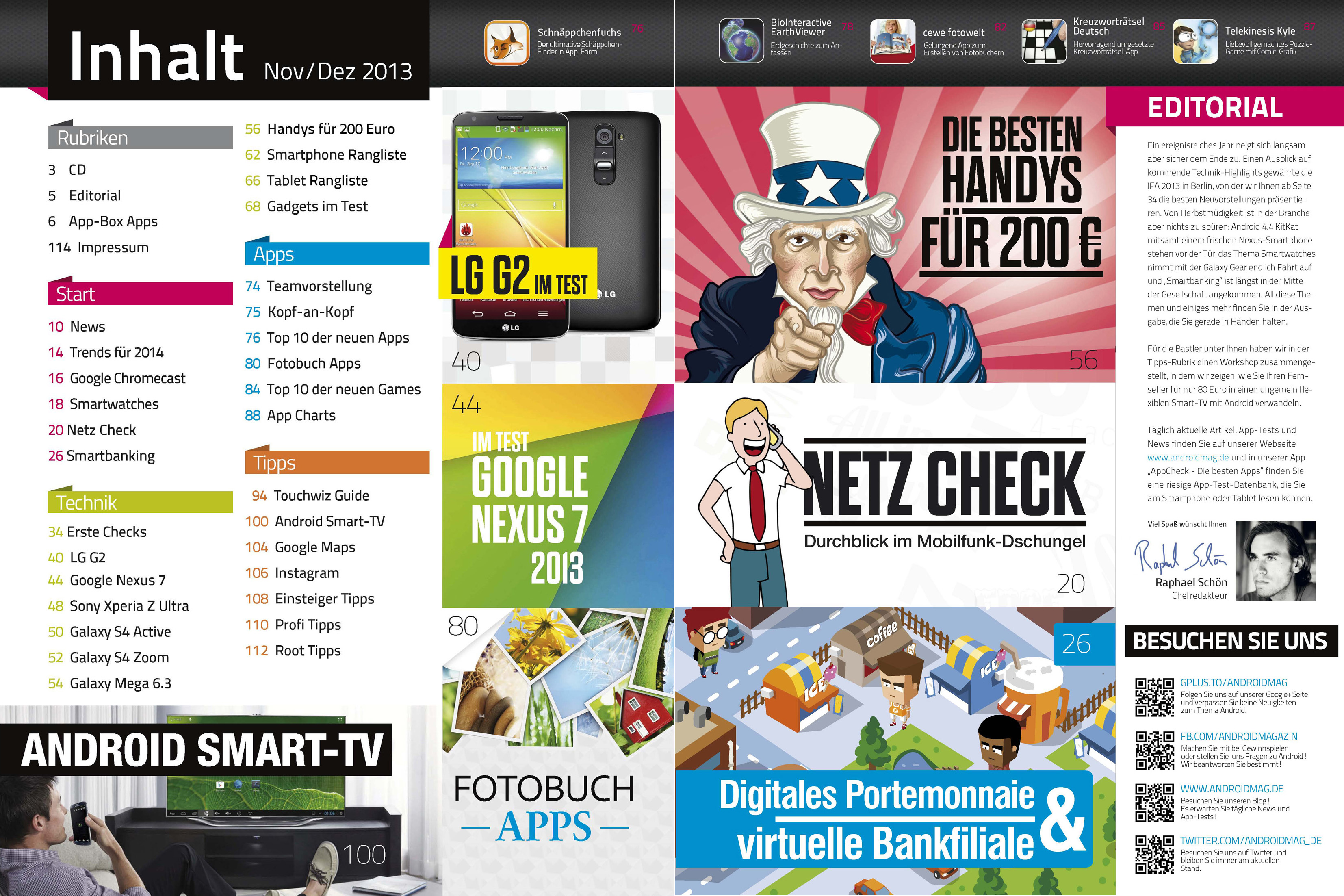 Vorher beschäftigen wir uns mit dem Inhalt dieser Ausgabe: Zum Start beschäftigen wir uns mit den wichtigsten Neuigkeiten aus der Welt des Androiden. Wir verraten euch außerdem, was die Trends des kommenden Jahres sind und werfen einen genaueren Blick auf den Chromecast-Dongle von Google. Die zwei Spezialthemen des Report-Abschnitts: Wir haben das österreichische und das deutsche Mobilfunknetz auf Qualität überprüft und verraten, welcher Anbieter sein Geld wert ist. Und apropos Geld: Auf sechs Seiten beschäftigen wir uns intensiv mit Smartbanking und der Zukunft des bargeldlosen Bezahlens.