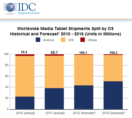 Das Marktanalyse-Unternehmen IDC hat kürzlich eine Statistik veröffentlicht, in der es heißt, dass im Jahre 2015 mehr Android Tablets  als iPads im Umlauf sein werden.Derzeit hält das Tablet aus dem Hause Apple einen Marktanteil von über 50%, 55% um genau zu sein. Dahinter befindet sich das Kindle Fire von Amazon mit rund 17%. Die restlichen Tablets werden auf Hersteller wie Samsung und Co. verteilt. IDC prophezeit einen Anstieg an Android Tablets und deren Marktanteilen. (Wär hätte das gedacht?)