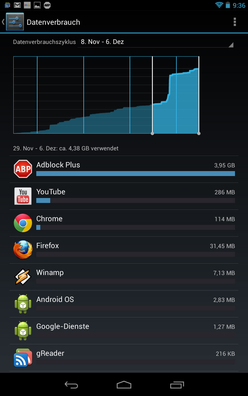 Anstatt den Datenverbrauch zu verringern wurde dieser ums Mehrfache potenziert – zumindest statistisch. Laut der Datenverbrauchs-Anwendung, welche ab ICS integriert ist, hat Adblock im Bewertungszeitraum von einem Monat rund 4 GB Traffic verbraucht. Zum Vergleich: YouTube, Chrome, etc. haben nicht ganz 400 MB verbraucht. Interessant, oder?