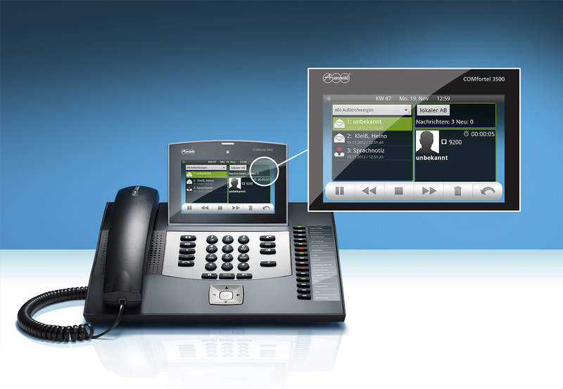 Tischtelefone waren noch nie so smart:  Auerswald führt das COMfortel 3500 ein. Via Touchscreen können Kontakte direkt vom Speicher aus angerufen werden. Auch die Synchronisation von Kalendereinträgen, E-Mails oder Kontaktdaten mit Google oder Microsoft Exchange sind kein Problem. Hinzu kommt auch noch, dass das Telefon über einen Anrufbeantworter verfügt, welcher auf der mitgelieferten 2 GB Speicherkarte 60 Stunden aufzeichnen kann. Diese kann natürlich um bis zu 8 GB erweitert werden. Je nach Anrufer können sogar bis zu 25 unterschiedliche Ansagen auf dem Gerät gespeichert werden.