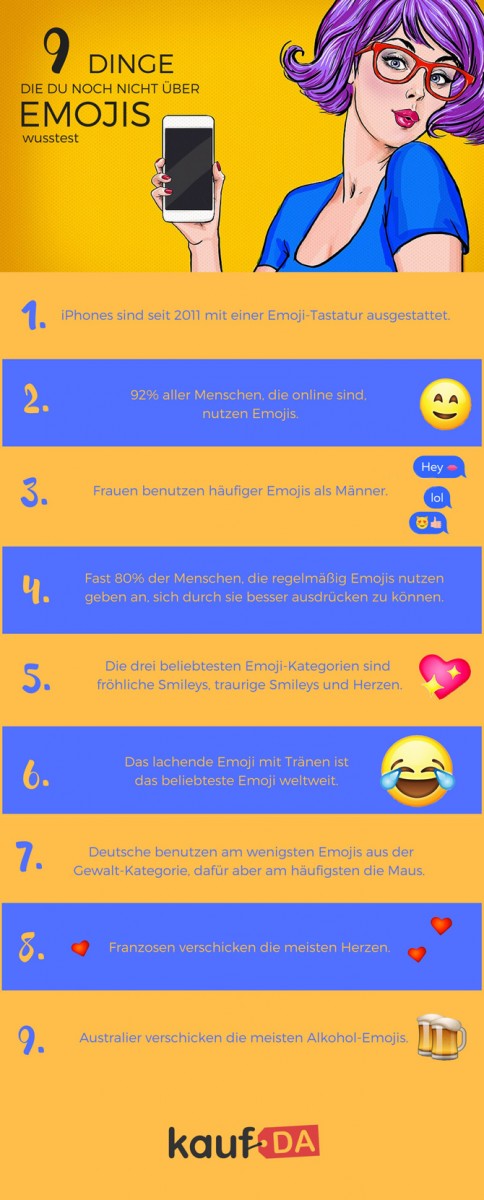 Es sind Fragen wie „Verwenden eigentlich alle Smartphone-Besitzer Emojis?“ oder „Wer verwendet sie häufiger? Frauen oder Männer?“. Aber auch „Welche Emojis sind in welchem Land am beliebtesten?“. Fragen, auf die wir hier Antworten bekommen. Antworten, die  das deutsche Online-Netzwerk KaufDA, das standortbezogen digitalisierte Einkaufsprospekte online stellt, ermittelt hat und uns zur Verfügung stellt.