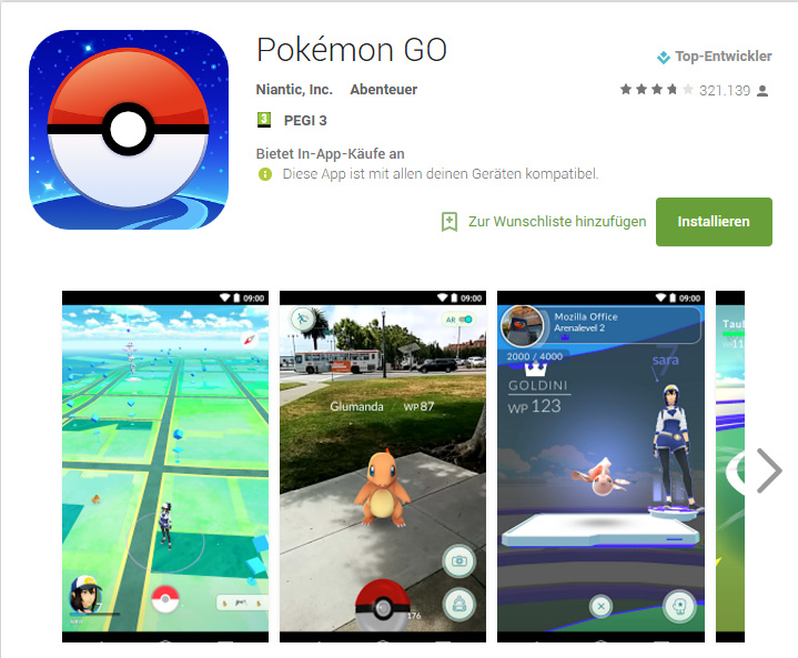 Doch auch hierzulande interessieren sich schon viele für das AR-Spiel, in dem man auf echte Jagd gehen kann, um auf virtuelle Pokémons zu treffen, die einem via Kamera angezeigt werden. Und viele haben sich bereits die APK-Datei von apk-mirror heruntergeladen. Doch nun müssen wir diesen Umweg nicht mehr gehen und wir können sicher sein, keine malwareverseuchte Version zu erhalten, denn nun laden wir das Spiel über den Play Store herunter.