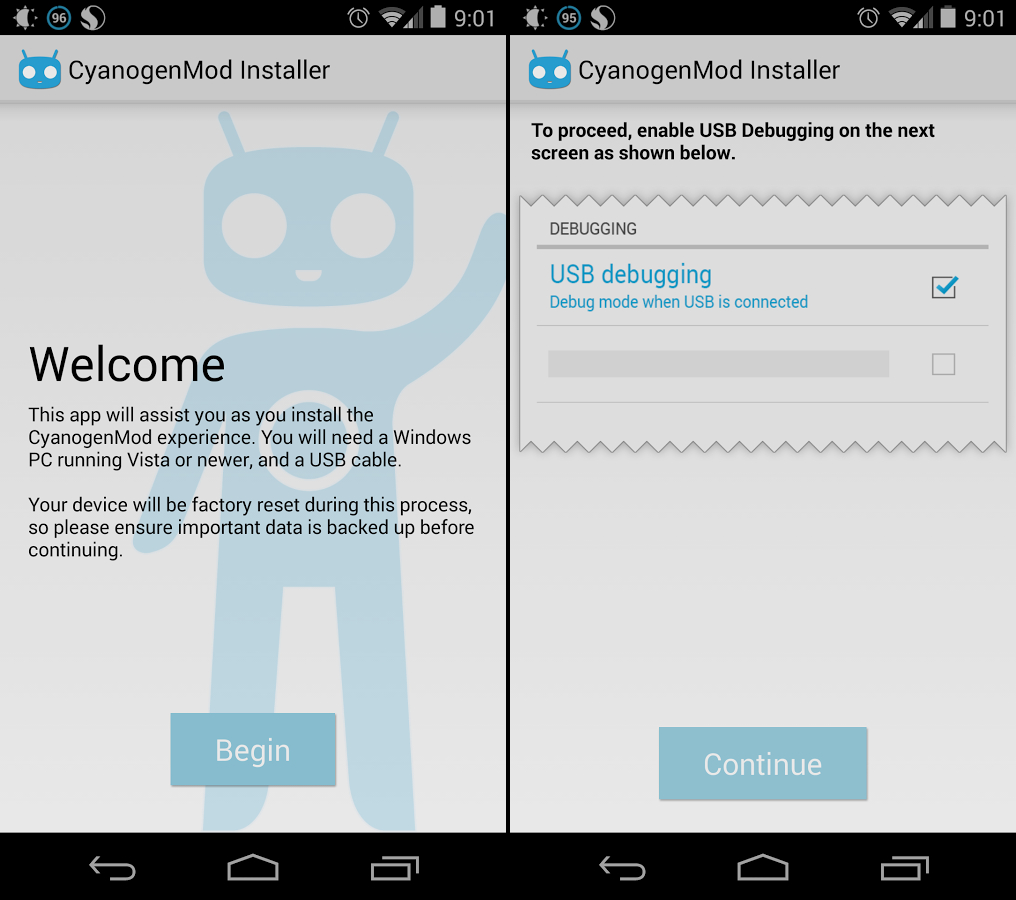 Für all diejenigen hat das CyanogenMod-Team nun endlich den versprochenen CM-Installer veröffentlicht. Dieser besteht auf zwei Teilen – einer App, die aus dem Google Play Store heruntergeladen werden kann, sowie einem Programm für Windows-Rechner (Eine Version für Mac OS ist in Arbeit). Die App macht letztendlich nichts anderes, als den Nutzer durch die nötigen Vorbereitungen zu führen, sprich USB Debugging zu aktivieren und gegebenenfalls das Dateiübertragungsprotokoll von MTP auf PTP umzuschalten.