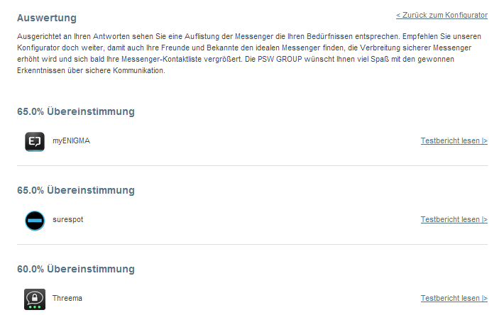 Am Wochenende haben wir über das Ergebnis des „Großen Messenger-Tests“ berichtet und dabei jede Menge positives Echo erhalten. Nun hat PSW Group einen Konfigurator entwickelt, der dir deinen Messenger präsentiert.