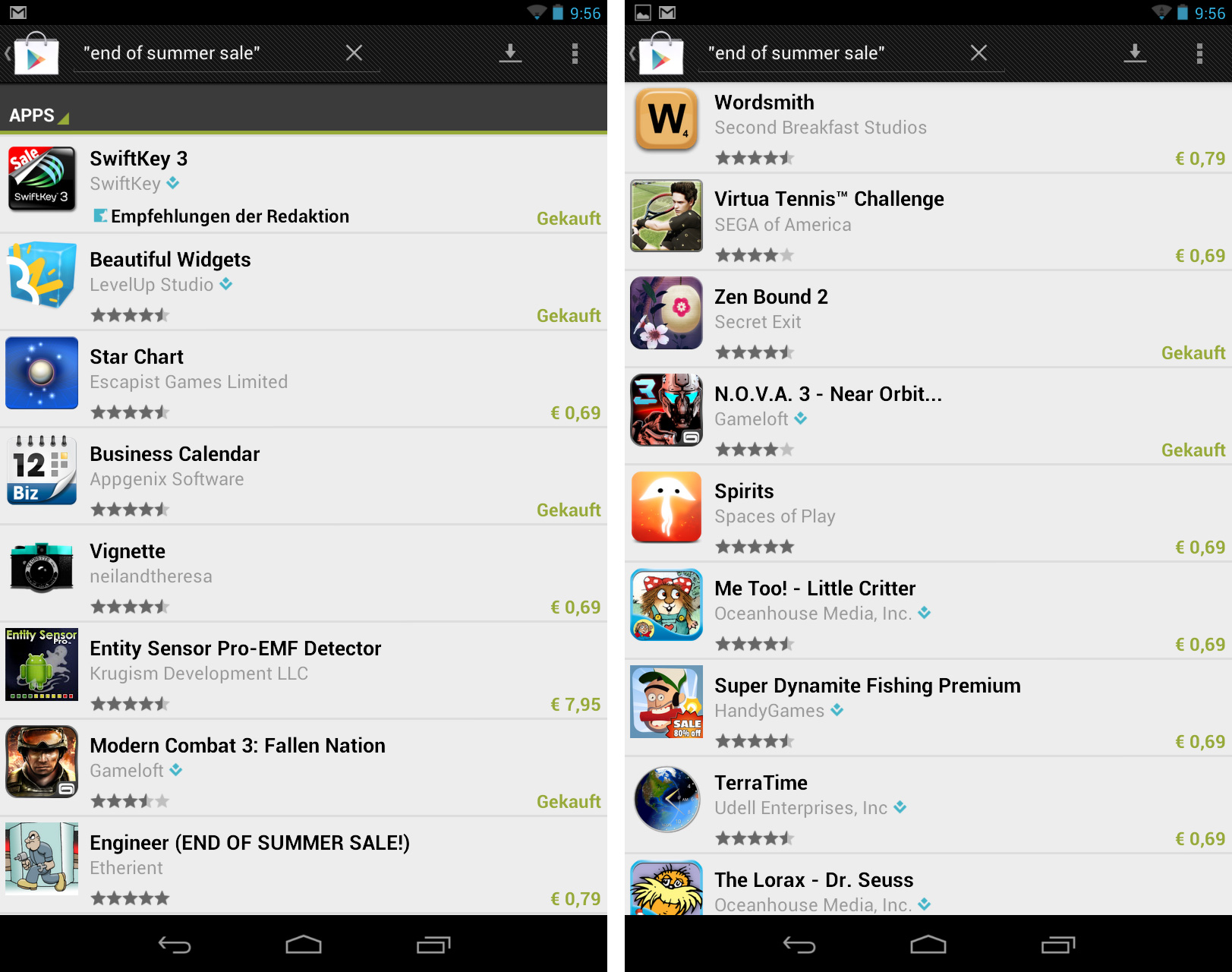 Sparfüchse aufgepasst: Im Zuge des “End of Summer Sale” gibt es im Google Play Store derzeit zahlreiche Apps und Games stark vergünstigt abzustauben. Apps wie Max Payne Mobile, SwiftKey 3 oder Zen Bound 2, die für gewöhnlich 1, 2 oder gar 3 Euro kosten, erhaltet ihr derzeit für 0,69 oder 0,79 Euro. Übrigens: Besonders stark vergünstigt sind Gameloft-Games wie etwa NOVA 3, Modern Combat 3 oder Gangstar Rio!