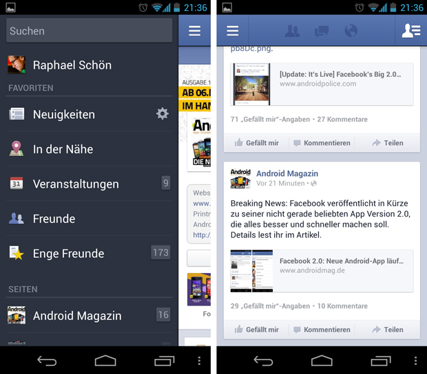 Optisch sind die Änderungen nicht allzu leicht auszumachen, die für die App zuständigen Entwickler bei Facebook sprechen aber von unzähligen Performance-Verbesserungen. So wurde etwa die Speichernutzung effizienter gestaltet und die in Android integrierte Scroll-Engine durch eine optimierte Eigenentwicklung ausgetauscht.