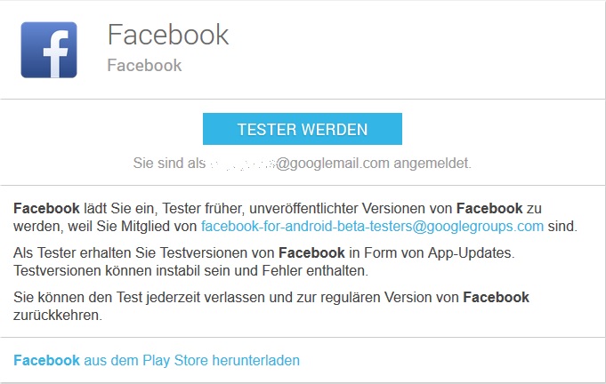 - Danach über folgenden Link auf die Betatestseite von Facebook in Google Play gehen und einfach “Tester werden” klicken.