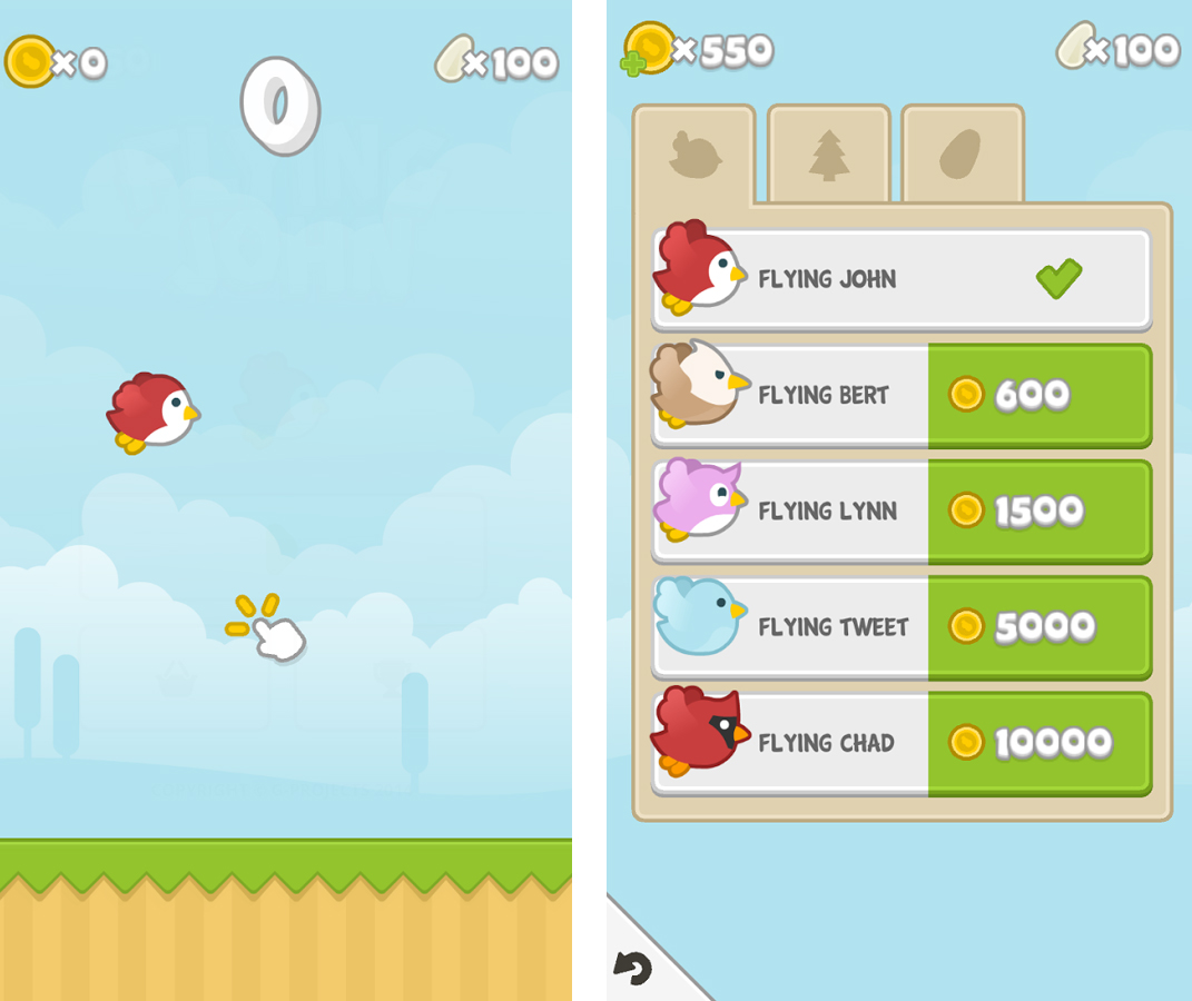 Anders als Flappy Bird bietet Flying John die Möglichkeit, sich mit erspielten Münzen einen neuen Vogel zu kaufen oder die Umgebung zu verändern. Wer sich die Münzen nicht erspielen will, der kann auch ins Portemonnaie greifen und bares Geld für die virtuellen Goldstücke bezahlen. Das Spielprinzip ist allerdings komplett ident mit jenem des Vorreiters.