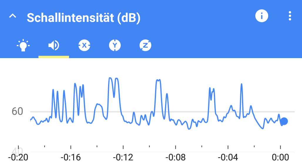 Es sind genaugenommen fünf Messungen, die die App vornehmen kann: Schall, Licht und die Beschleunigung in jeder der drei Raumachsen. Dazu greift sie auf die Sensoren im Smartphone zurück.