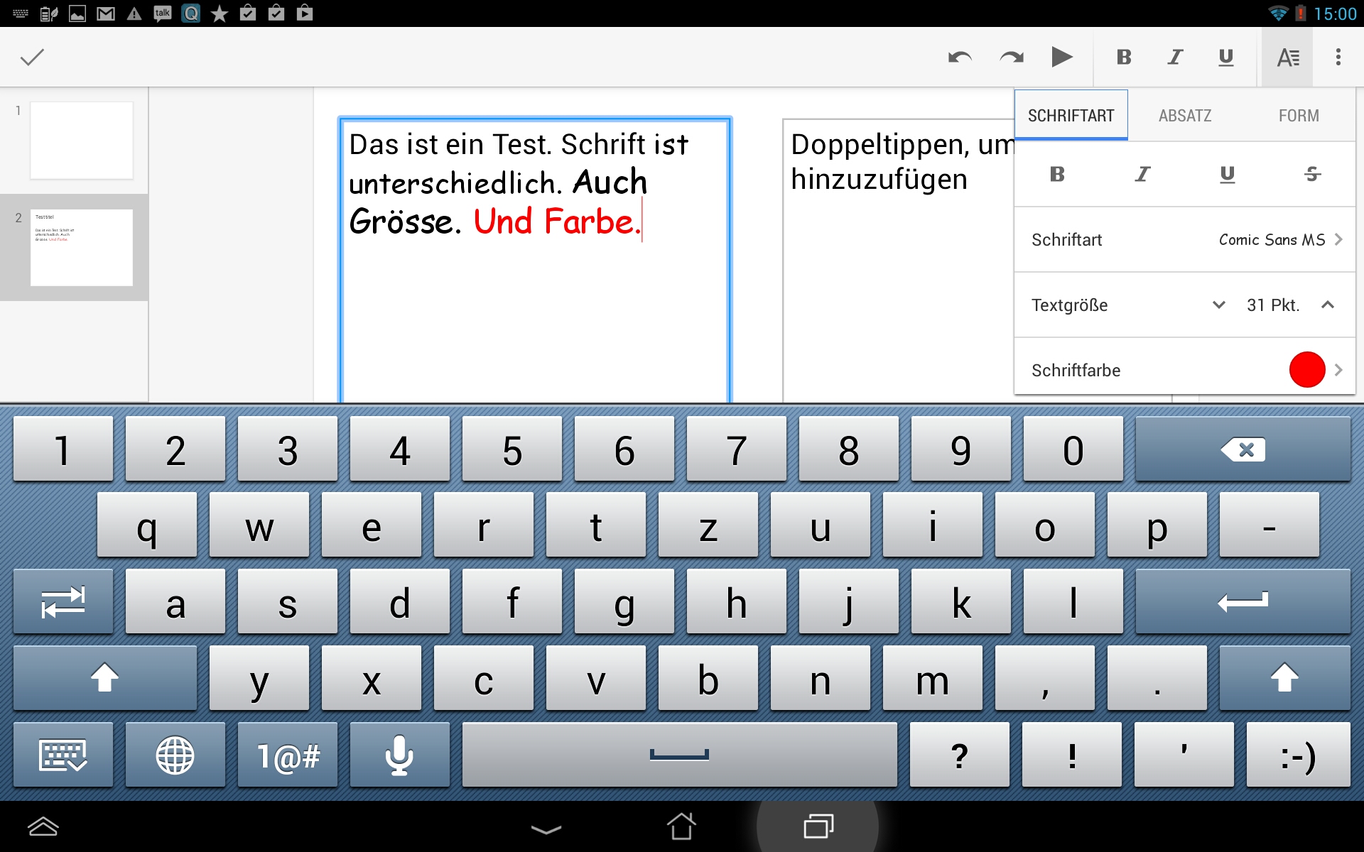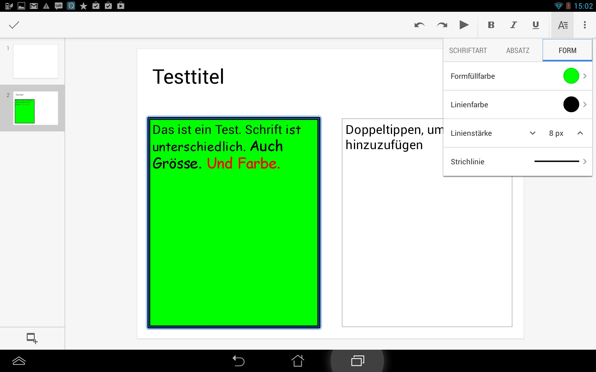 Allzu viel kann man mit der mobilen Version der Tabellenbearbeitung ja nicht machen: Schriftart, -größe und -farbe lassen sich variieren, ebenso werden einige Absatzformate geboten und die Zeilenabstände können eingestellt werrden. Und schließlich noch die Linien- und Füllfarbe sowie die Linienstärke. Aber mann kann auch ins pptx-Format speichern. Und natürlich für andere freigeben und zusammen mit anderen bearbeiten. Gespeichert wird alles automatisch.