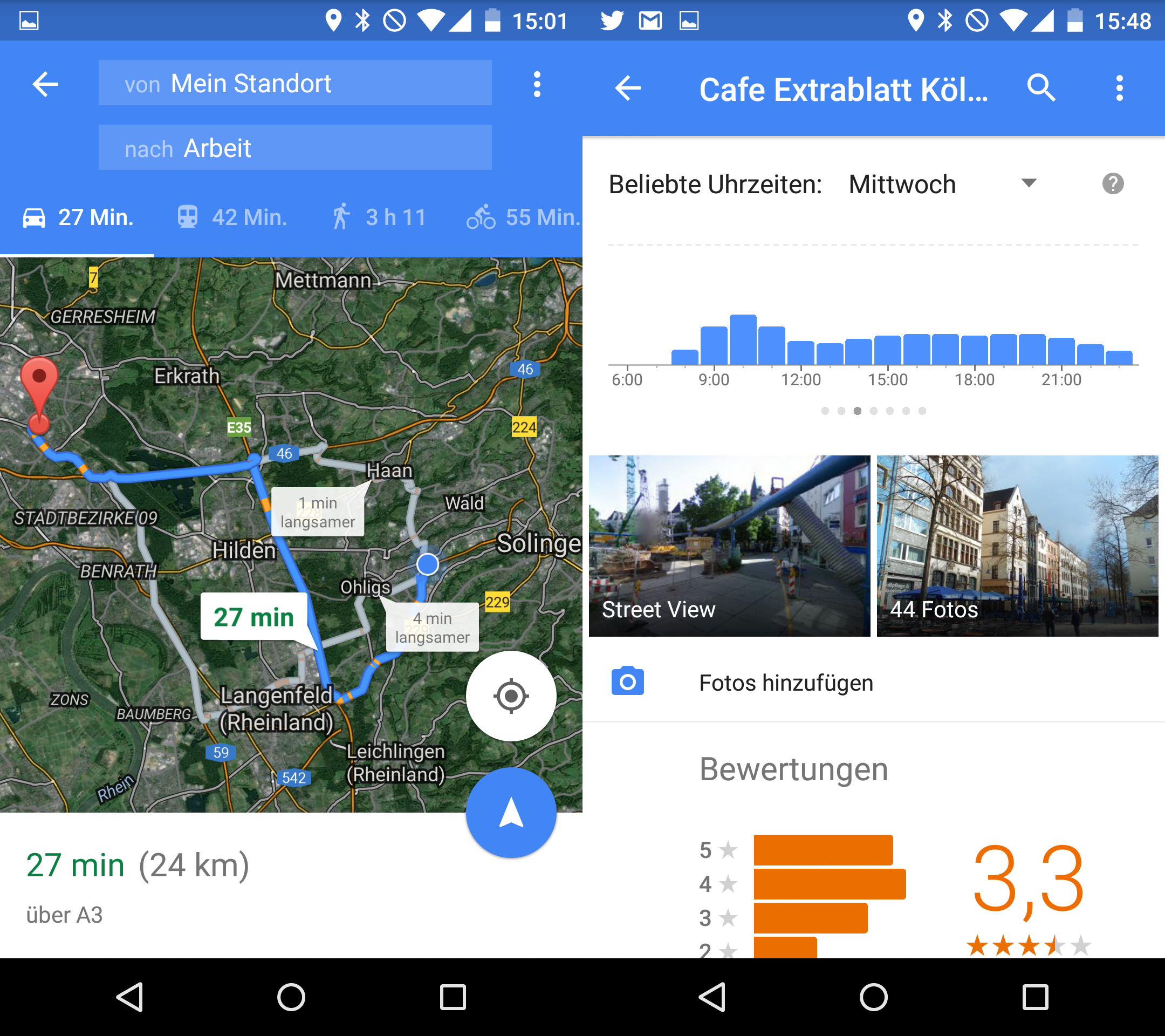 Die möglichen Transportmittel – also entweder mittels PKW, zu Fuß, Fahrrad oder per Bus oder Bahn – hausen nun über den Start- und Zielangaben. Clever: Neben den jeweiligen Transportmitteln wird jetzt angezeigt, wie lange die Fahrt vorraussichtlich dauern wird. Das spart den auf Smartphones- und Tablets so wertvollen Bildschirmplatz. Eine präzise Ansicht über Zwischenschritte, Verkehrswarnungen, Steigung und Gefällen und weiteren Details öffnet sich, wenn die Karte einer einzelnen Route nach oben gewischt wird.  Über das seitliche 3-Punkt-Menü lassen sich jetzt außerdem erweiterte Optionen wie den Rückweg, das Gelände oder die Verkehrslage einsehen.  Zu guter Letzt zeigt die neue Google Maps-Version nun auch die Auslastung von Restaurants, Café und anderen Lokalitäten an, sodass der Nutzer nicht unbedarft in Stoßzeiten landet.