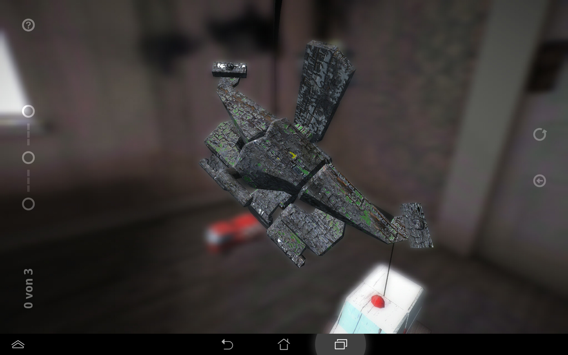 Du kehrst zurück in deine Kindheit, zumindest virtuell. In deinem Kinderzimmer hängt ein Mobile, auf dem jede Menge Spielzeug hängt. Doch die Spielsachen sind nicht richtig zusammengesetzt bzw. wurden die einzelnen Teile um alle nur denkbaren Achsen verdreht. Okay, es gibt nur drei, aber das genügt allemal. Deine Aufgabe ist, die ursprüngliche Form wiederherzustellen. Also drehst du per Fingerwisch den Gegenstand nach links, rechts, oben und unten. Ob du um die vertikale Achse oder die horizontale Achse drehst, bestimmst du durch den Ankerpunkt, also den Punkt, wo du auf das Ding tippst. Und siehe da, nach einigem Drehen und Wenden entstehen Flugzeuge, Feuerwehrautos, Kräne, Tiere uvm.