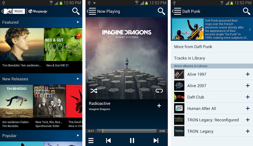 Mit MTV Music powered by Rhapsody können Android-Nutzer ohne Probleme entspannt Musik genießen und das in jeder Situation. Die intuitive Steuerung und die große Auswahl an Stücken begeistert. Mit dem Erstellen von Playlists lassen sich beliebte Titel schnell finden, legal und schnell herunterladen.