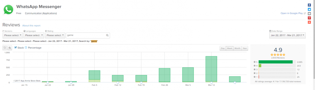 Vor dem Update lag die durchschnittliche Bewertung bei 4,1. Die Welt schien mit der App zufrieden zu sein. Doch danach hagelte es 1-Sterne Bewertungen en masse. WhatsApp wurde für das Entfernen der alten Statusmeldung hart abgestraft. Im Zeitraum von Mitte Januar bis Mitte März lag der Durchschnitt bei 3.4. das ist deutlich unter dem langjährigen Schnitt. Die letzte Februarwoche, also gleich nach dem Update brachte gar nur knapp über 2 im Schnitt.