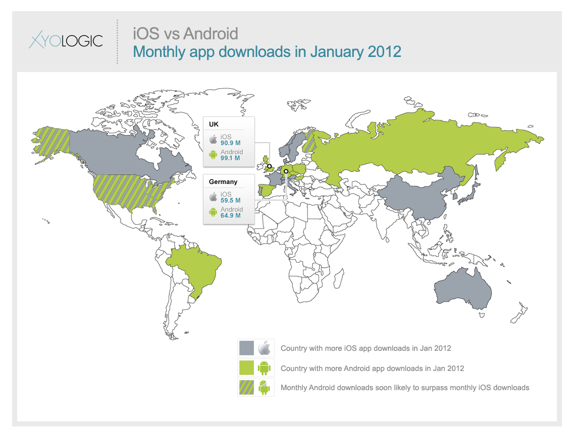 Bis Juni 2012 wird Android die Führung bei den monatlichen Downloads weltweit übernommen haben, das prognostiziert  das Research-Unternehmen Xylogic. Und die Prognose dürfte aufgehen. Ein Land nach dem nächsten wird von den Droiden dominiert.