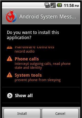 Der Trojaner gibt sich als “Android System Message” aus und verlangt, dass man den Install-Button antippt um das “Update” zu installieren. Einmal geschehen, ist es zu spät, das Programm zeichnet alle Telefonate im .amr Format auf und versendet sie. Zusätzlich speichert der Trojaner diverse Informationen über das Gespräch, wie etwa dessen Dauer, in einer seperaten Textdatei. Eigentlich sollte die Malware auch in der Lage sein, die gespeicherten Gespräche auf einen Server zu laden. Laut den Analysten von Total Defense sei dieser Teil des Codes aber durch einen Tippfehler nicht aktiv.