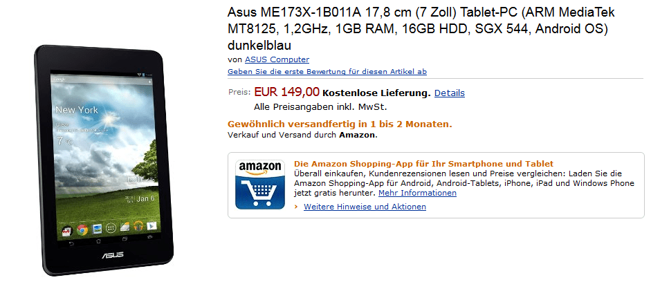 Asus engagiert sich abermals als Preisbrecher im Tabletsektor – der neueste Wurf kostet nur mehr 150 Euro, bietet aber trotzdem attraktive Spezifikationen (Bildquelle: Amazon)