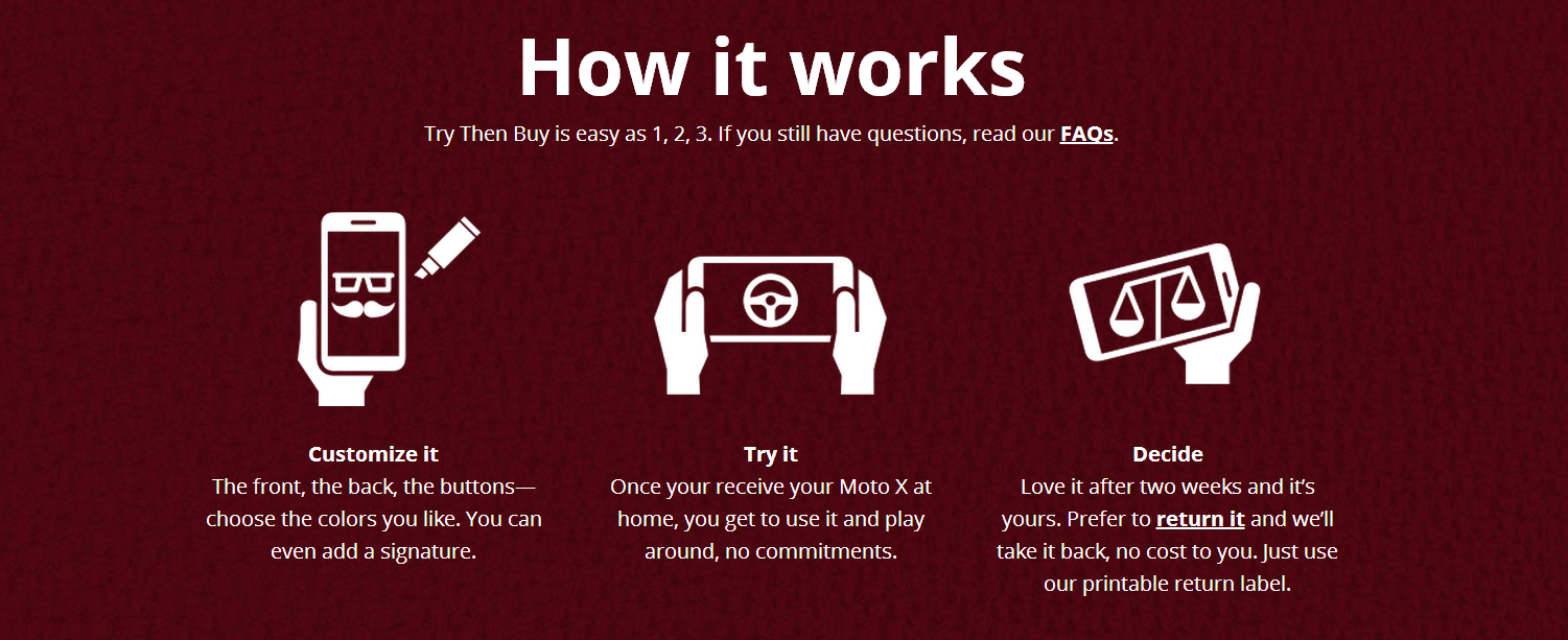 Die Idee dahinter ist indes genial. Du kaufst ein Moto X für 1 Dollarcent, lässt es dir nach Hause schicken und testest es ausführlich zwei Wochen lang.
