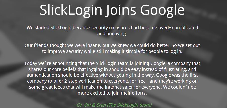 Die Übernahme kommt für SlickLogin übrigens zu einem sehr frühen Zeitpunkt – das Unternehmen ist noch nicht einmal ein Jahr alt. Bisher hat man auch noch kein fertiges Produkt vorzuweisen, da man noch an der Technologie arbeitet. Die aus den drei Firmengründern bestehende Belegschaft, kann sich nun aber darauf freuen, finanzielle und personelle Unterstützung von Google zu erhalten.
