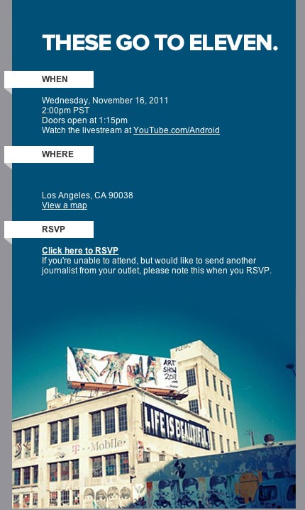 Und wieder einmal Geheimniskrämerei von Google. Am 16. November findet in Los Angeles ein Spezial-Event statt, für den Google Einladungen ausgeschickt hat. Als Absender fungiert der Band-Gitarrist Nigel Tufnel der fiktiven Band „Spinal Tap“. Dieser Absender und der Titel der Einladung „These Go to Eleven“ lassen auf einen Google-Music Event schließen. Der Satz „These Go to Eleven“ stammt schließlich aus dem Musik-Mockumentary ”This is Spinal Tap”.