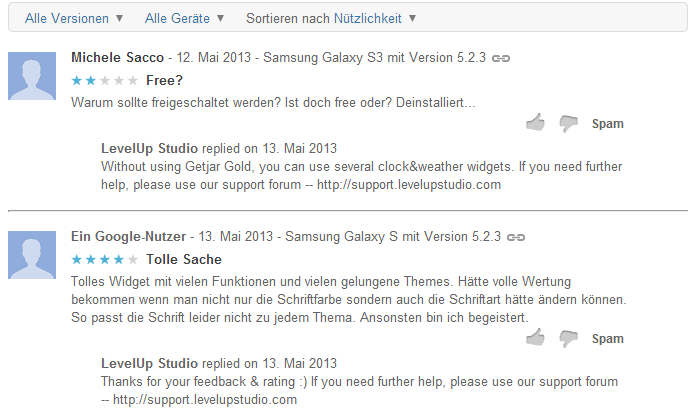 Was einige handverlesene Top-Entwickler von Android-Apps bereits seit ungefähr einem Jahr können, wird jetzt von Google für alle freigeschaltet: Feedback auf Bewertungen von App-Nutzern geben.