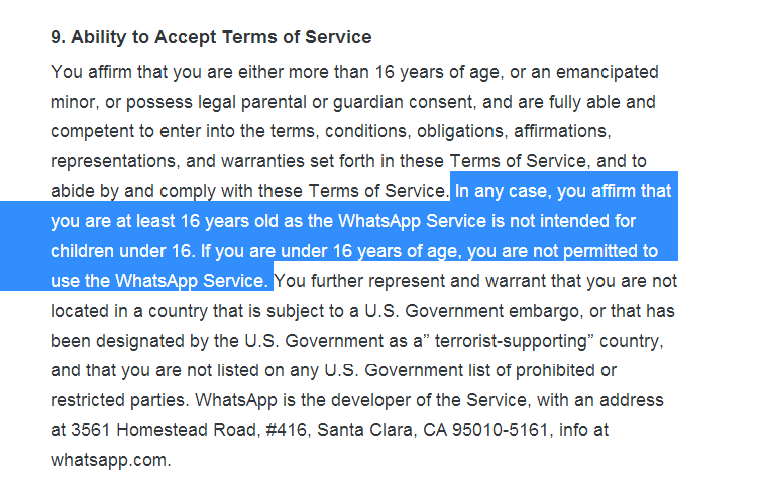 Doch nun zu unserem eigentlich Thema: Im Zuge der Recherchen hat besagter Anwalt auch einen Passus in den AGBs (Punkt 9) gefunden, der eigentlich zum Lachen anmutet: „In any case, you affirm that you are at least 16 years old as the WhatsApp Service is not intended for children under 16. If you are under 16 years of age, you are not permitted to use the WhatsApp Service.“ – „Jedenfalls bestätigst du, dass du älter als 16 Jahre alt bist, denn WhtasApp ist nicht geeignet für Kinder unter 16 Jahren. Wenn du unter 16 Jahre alt bist, dann ist es dir nicht erlaubt, den WhatsApp-Service zu nutzen.“