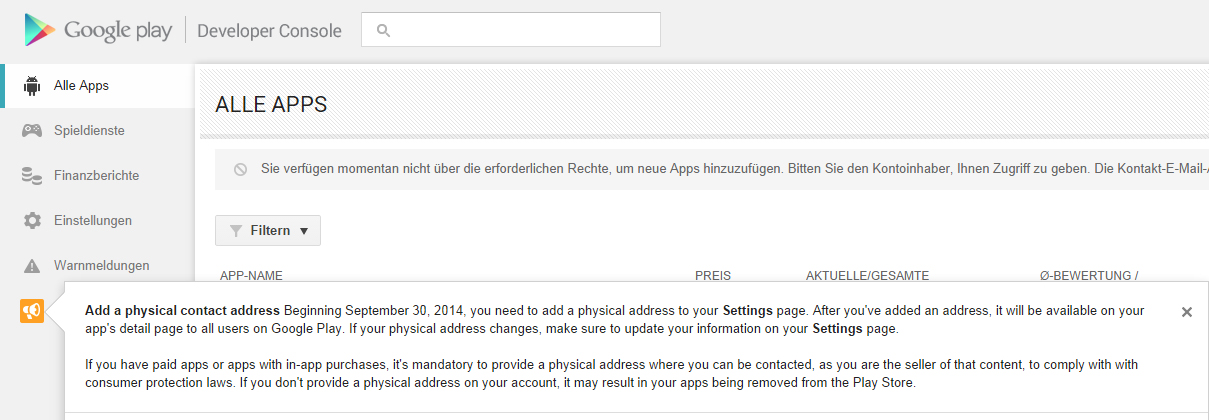 - Google verlangt von den Entwicklern, die in-App-Käufe oder kostenpflichtige Apps anbieten, dass eine physische Anschrift hinterlegt wird. Diese wird den Nutzern in der Auflistung der App auch angezeigt werden. Ab Ende September haben betroffene Entwickler 30 Tage Zeit, dieser Forderung nachzukommen. Tun sie das nicht, wird Google Maßnahmen ergreifen. Welche, das sein werden, lässt Google noch offen. Eventuell kann man dann keine neuen Apps mehr veröffentlichen oder man fliegt generell aus dem Play Store.