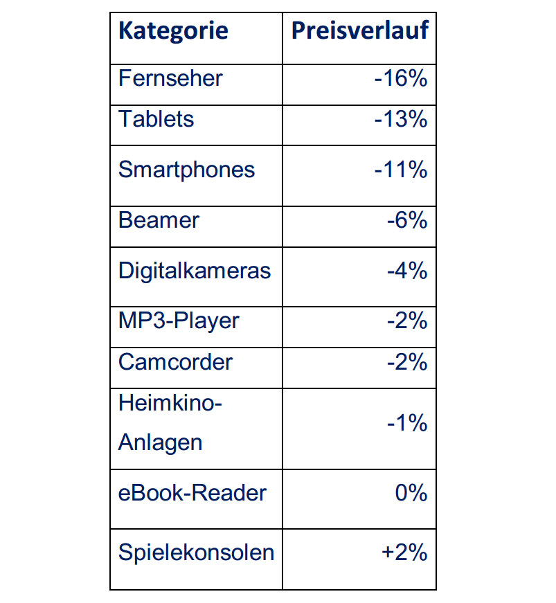 Kaum bzw. geringe Preissenkungen gab es bei Beamern, Digitalkameras, MP3-Playern und Camcordern. Wozu auch? Diese Geräte kauft doch eh keiner mehr…