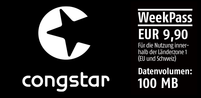 Damit Urlauber oder Geschäftsreisende auch im EU-Ausland entspannter mobil surfen können, bietet der Mobilfunk-Discounter congstar ab sofort für seine Kunden mit Prepaid und Postpaid Tarifen einen neuen WeekPass an. Für die Nutzung innerhalb der Länderzone 1 (EU und Schweiz) kostet der WeekPass günstige 9,90 Euro. Er beinhaltet ein Datenvolumen von 100 MB und ist acht Tage lange gültig. Umgerechnet kosten 1 MB Daten im Ausland also 9,9 Cent. Die Abrechnung erfolgt nach „Parkuhr-Logik“: Ab dem Buchungszeitpunkt ist das Surfen mit dem Smartphone für einen Zeitraum von acht mal 24 Stunden möglich, unabhängig vom Wechsel des Kalendertages. Das Angebot ist Teil des Produktportfolios „Travel & Surf“, zu dem auch die DayPasses gehören (in der EU und Schweiz: DayPass M mit 50 MB Inklusivvolumen für 2,90 Euro für 24 Stunden).