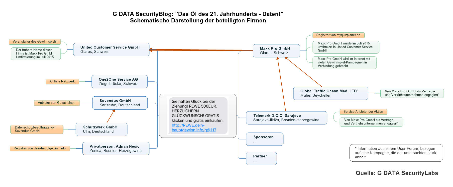G-Data hat ein wenig hinter die Kulissen des Gewinnspiels geschaut und öffentlich verfügbare Informationen über die beteiligten Firmen eingeholt (siehe Abbildung):