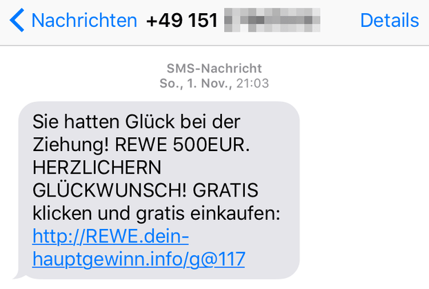 Alles beginnt mit einer SMS In unserem Fall wird ein vermeintlicher Gratis-Einkauf bei Rewe versprochen. Angeblich wurden wir gezogen und haben 500 Euro für den Einkauf zur Verfügung. Nicht schlecht. Wir sind natürlich interessiert daran.