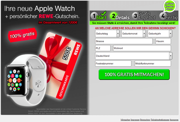 Jedenfalls wird der Besucher auf der Seite von einem weiteren Angebot überrascht: Eine Art Glücksrad suggeriert, dass zu einem Rewe Gutschein gleich noch ein Preis hinzukäme: Ein iPhone 6S oder eine Apple Watch.