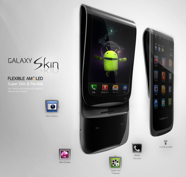 Entwickelt von Designer Heyon You soll das Samsung Skin über ein 4-Zoll Super AMOLED Display verfügen und eine Auflösung von 800×480 Pixel bieten. Eine integrierte Kamera mit 8MP und 720p HD Video-Aufnahmefunktion sei auch geplant. Ebenso integriert soll auch ein kleiner Videoprojektor/Beamer sein. Ein Hindernis ist derzeit noch der Akku – eine derart futuristische Ausstattung benötigt eben entsprechend viel Strom. Samsung arbeitet dafür an einem Konzept für extra flache und flexible Akkus. Deren Leistungsfähigkeit ist aber noch nicht das, was man sich erwünscht. Bis das fertige Produkt auf den Markt kommt, müssen wir uns also erstmal mit den Bildern begnügen.